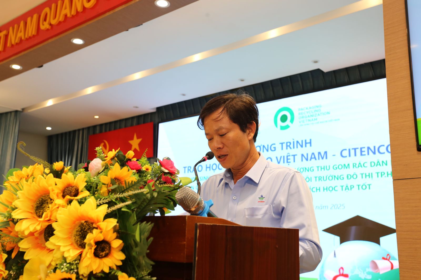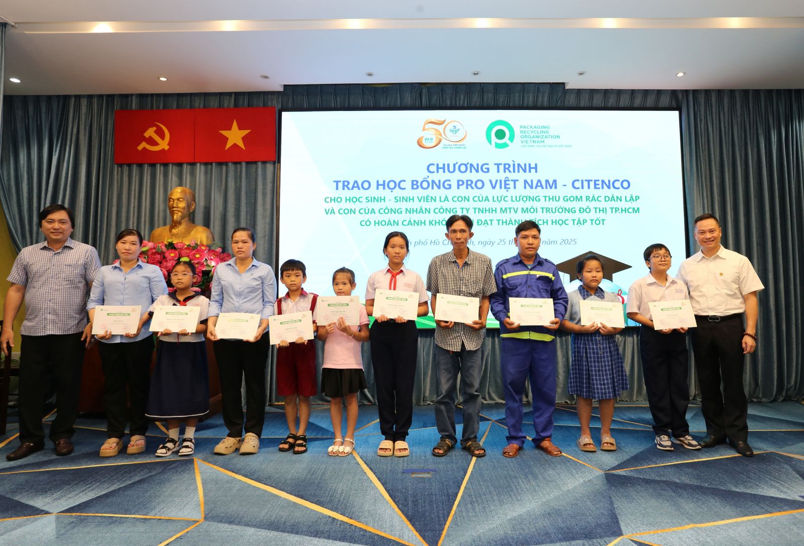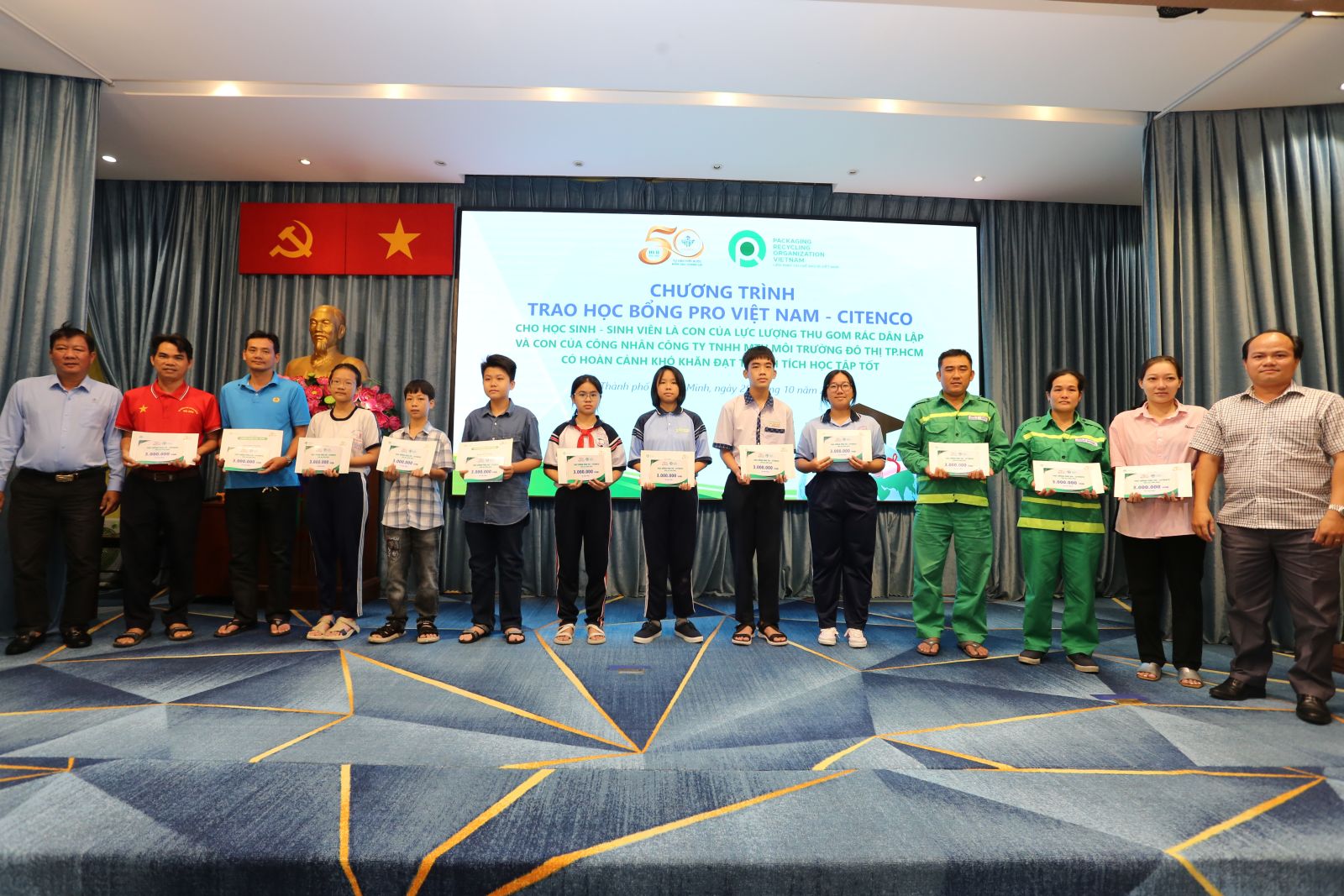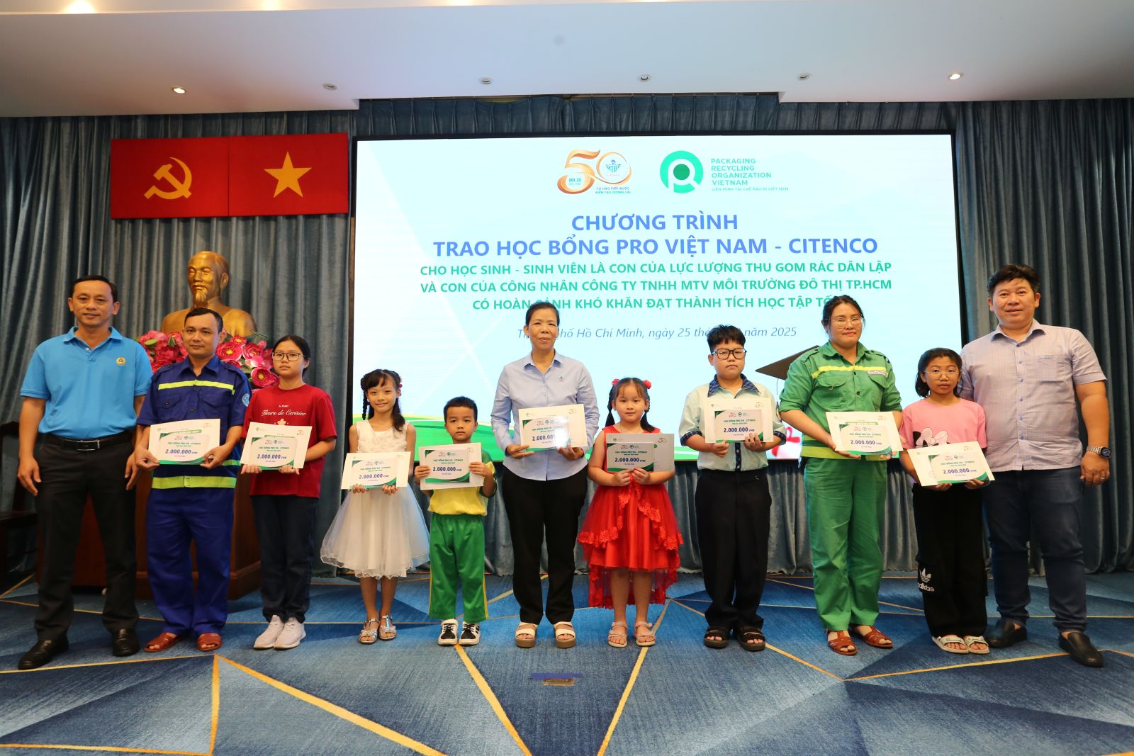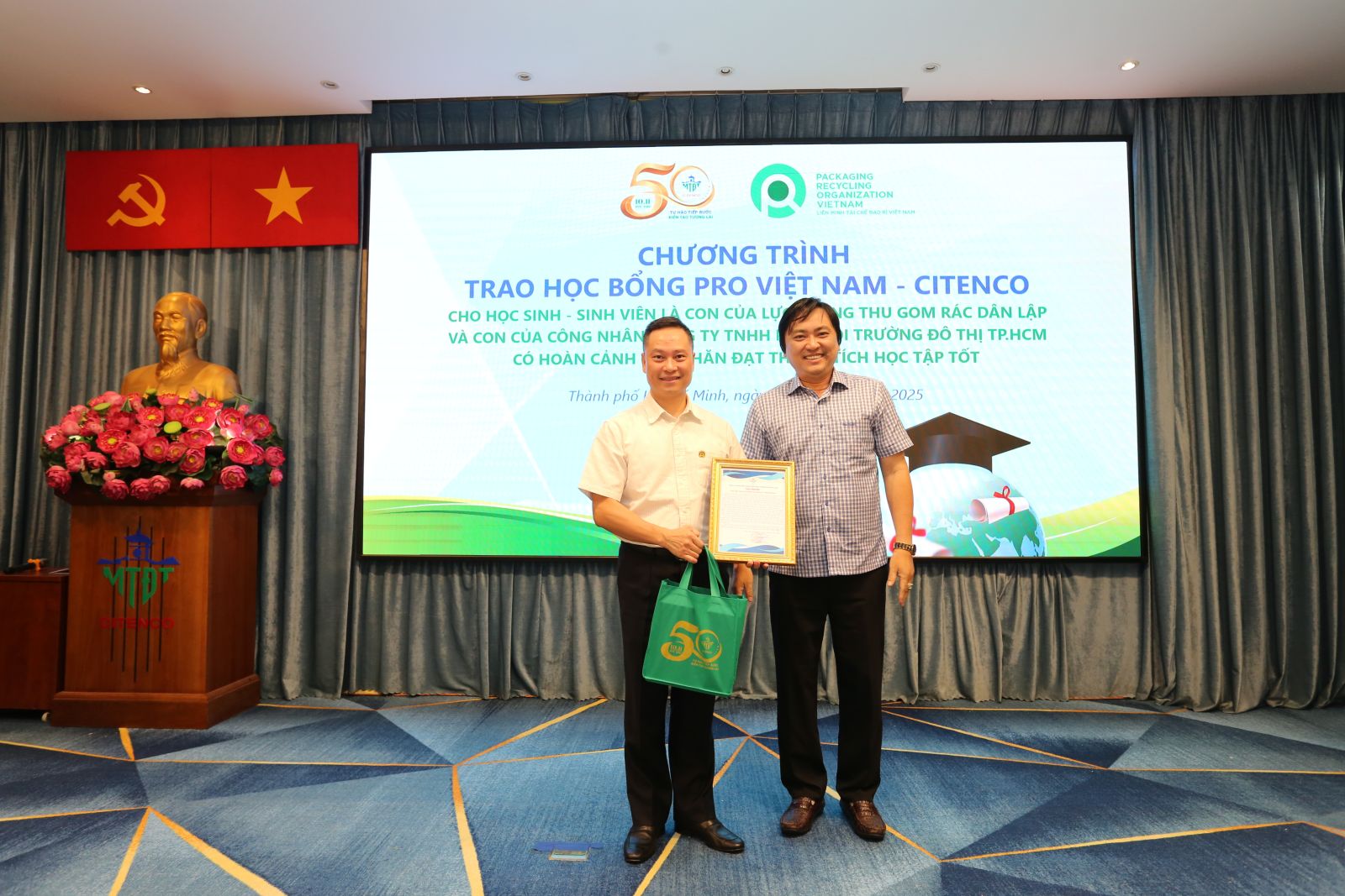 Sáng ngày 25.10.2025, tại Công ty TNHH MTV Môi trường Đô thị TP. HCM (CITENCO), lễ trao Học bổng PRO Việt Nam – CITENCO năm học 2025–2026 đã được long trọng tổ chức trong không khí ấm áp, đầy ý nghĩa. Tham dự buổi lễ về phía Công ty Cổ phần Tái chế Bao bì – PRO Việt Nam có ông Nguyễn Gia Huy Chương, Giám đốc điều hành; về phía Công ty TNHH MTV Môi trường đô thị TP. HCM có ông Lê Công Phương, Phó Bí thư Đảng uỷ, Giám đốc Công ty; ông Cao Văn Tuấn, Đảng uỷ viên, Chủ tịch Công đoàn Công ty, các ông bà đại diện lãnh đạo các phòng nghiệp vụ, Giám đốc các Chi nhánh và đặc biệt là sự hiện diện của các em học sinh, sinh viên là con công nhân quét rác, công nhân thu gom, vận chuyển rác của Công ty và lực lượng thu gom rác dân lập trong lĩnh vực vệ sinh môi trường